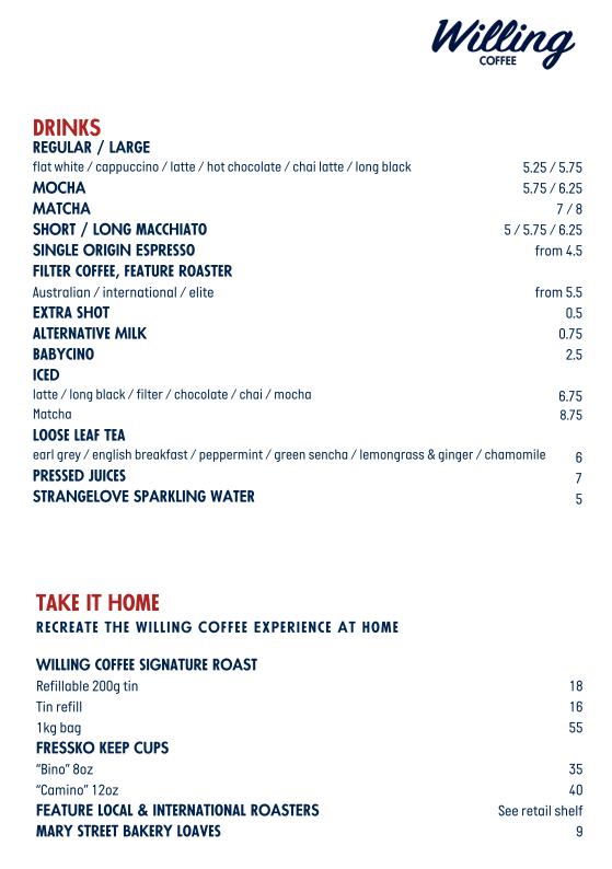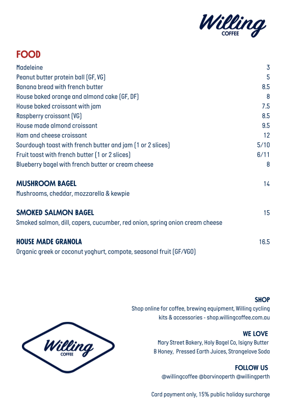 From a reviewer’s perspective, the menu at Willing Coffee Guildford impresses with a simple yet satisfying lineup that perfectly complements its standout brew program. The café showcases a Speciality Coffee selection featuring beans from rotating roasters and expertly crafted espresso‑based drinks - including the richly layered Coffee and refreshing Iced Latte - that highlight its dedication to quality and precision. On the food side, brunch lovers will find the savoury Mushroom Bagel and the equally enticing Salmon Bagel, both of which balance fresh ingredients with comforting flavours, making them ideal pairings for the house coffees. While specific prices aren’t publicly listed, the emphasis on well‑made drinks and thoughtfully assembled bagels underpins the café’s reputation as a neighbourhood favourite for a relaxed breakfast or mid‑morning stop in Guildford.